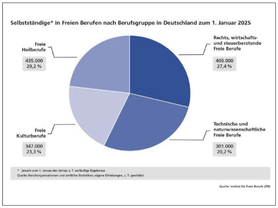 Das Institut für Freie Berufe (IFB) hat für den Bundesverband der Freien Berufe (BFB) die Statistik zu den Selbstständigen in den Freien Berufen zum Stichtag 01.01.2025 erhoben.